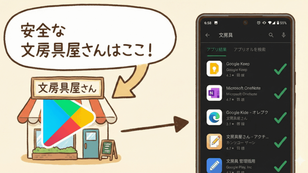 ここは、Googleの厳しい審査を通過したアプリだけが並んでいる、いわば「安全な文房具屋さん」です。