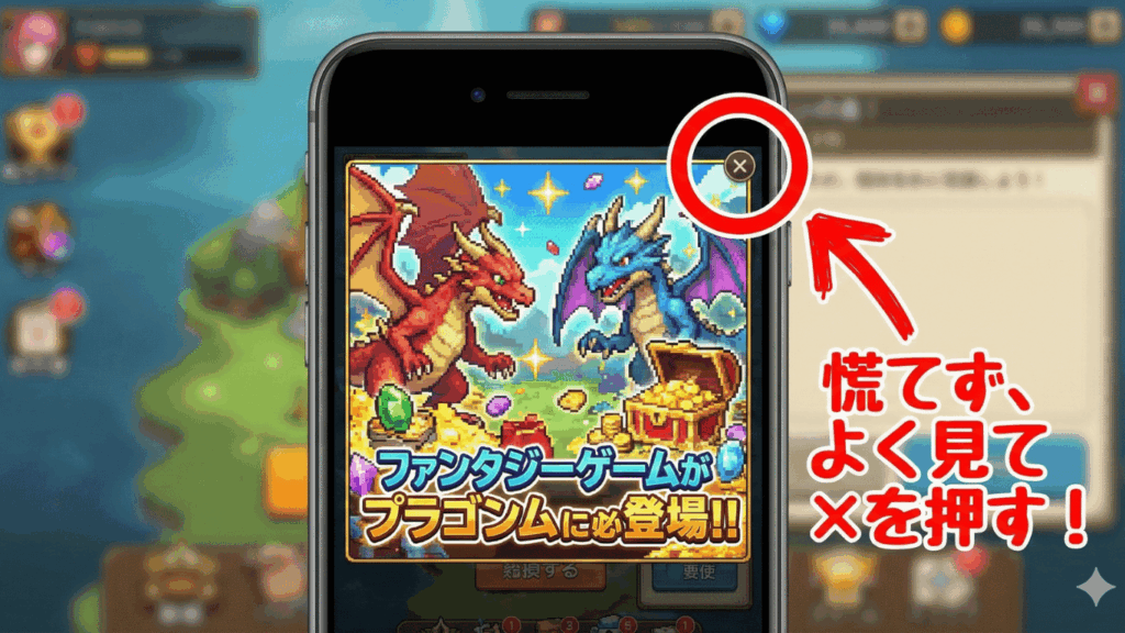 【要注意!】シニアを狙う広告の罠 一番気をつけてほしいのは、ゲーム中に出てくる「広告の消しにくさ」です。 「×」ボタンがものすごく小さくて、間違えて広告をタップしてしまい、よくわからないサイトに飛ばされてしまうことがあります。 また、「ウイルスに感染しました!今すぐここを押して!」といった、人を焦らせる嘘の警告(これも実は悪質な広告の一種です)が出ることがあります。