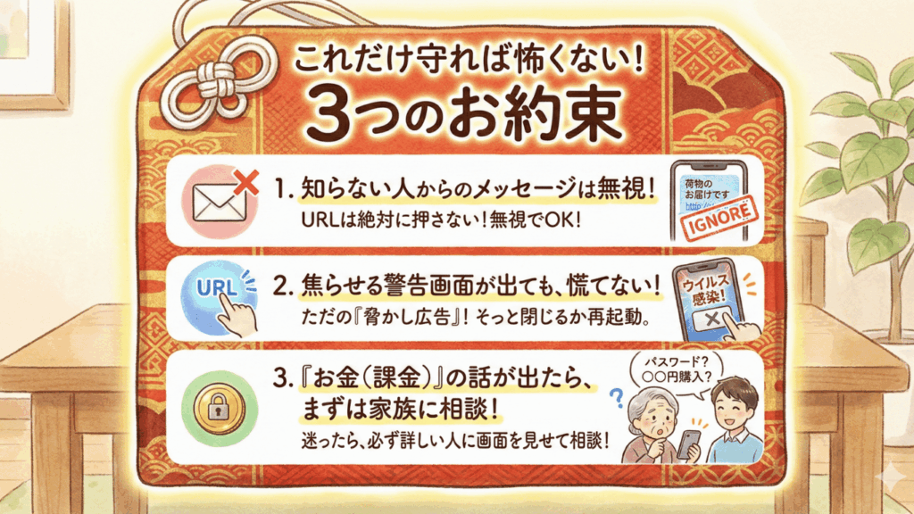 最後に、スマホを安全に楽しむために、私が妻と約束している「3つのルール」を皆さんにもお伝えします。これだけ守れば大丈夫です!